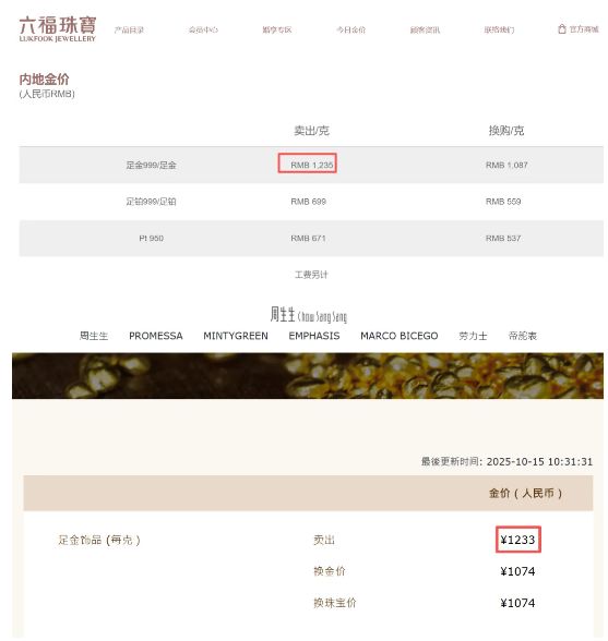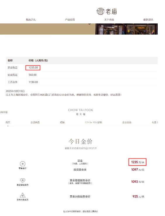 与此同时,国内金饰价格持续走高。10月15日,据各大品牌官网,老庙黄金、周大福、六福珠宝等品牌的足金饰品价格均已达到1235元/克,周生生为1233元/克,较前一日均有明显提升。