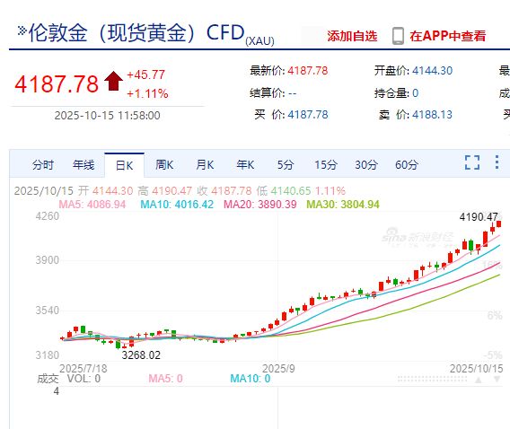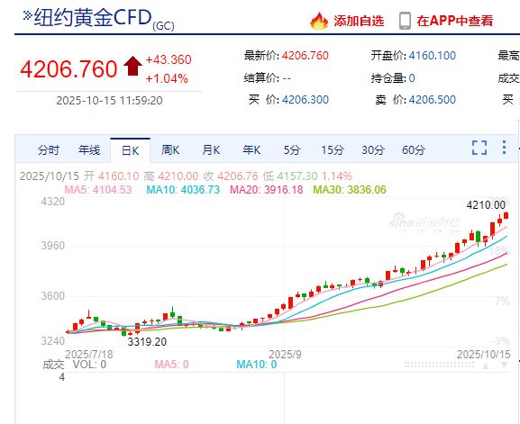 10月15日上午,现货黄金价格继续走高,盘中触及4190.47美元/盎司的高位;纽约黄金一度触及4210美元/盎司,均再创历史新高。