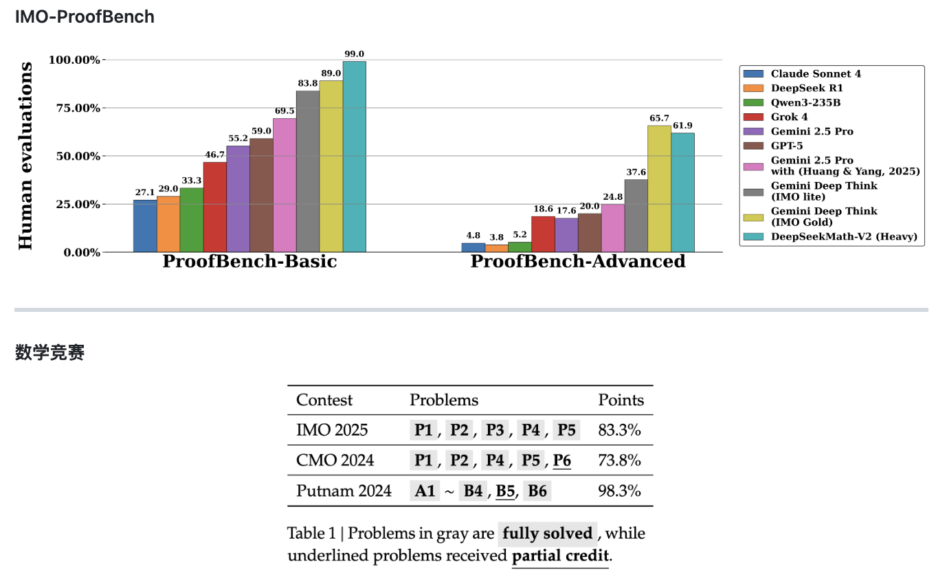 在同步发布的技术论文中,DeepSeek表示,Math-V2的部分性能优于谷歌旗下的Gemini DeepThink,并展示了模型在IMO-ProofBench基准以及近期数学竞赛上的表现。